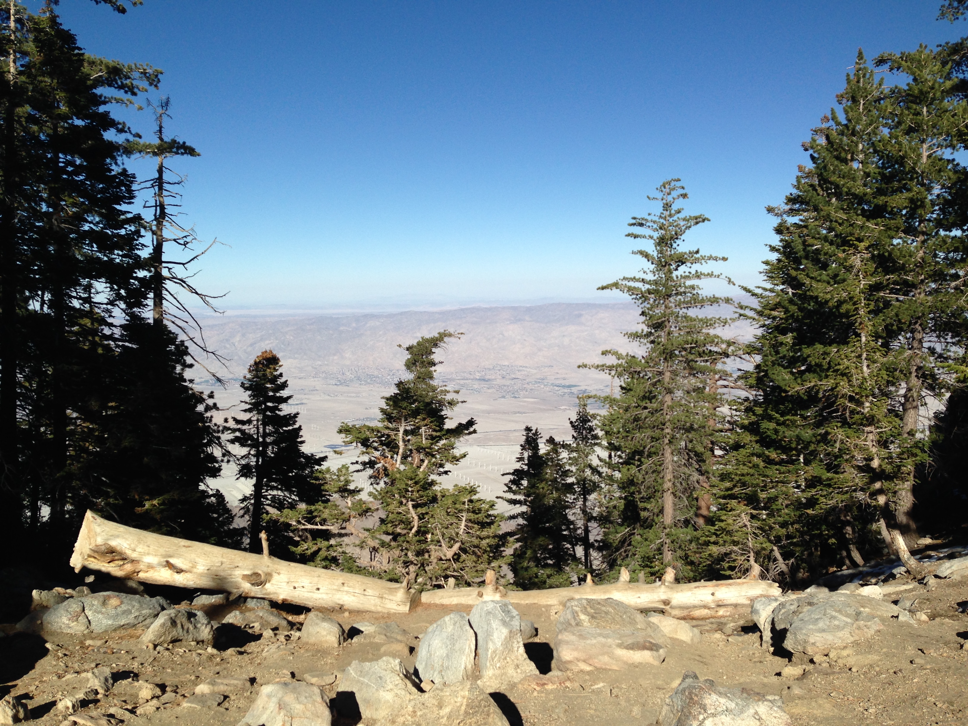We spent most of Saturday going up to the Palm Springs Aerial Tramway. There, a Swiss-made cable car whisks you way up to the top of San Jacinto Peak and offers spectacular views of the Coachella Valley below and the surrounding mountain ranges. The platform in the gondola actually rotates, so you can get a 360 degree view of the scenery. The temperature was significantly cooler at the top of the mountain, but wasn’t too terribly cold. There were actually patches of snow on the ground at the mountaintop. There is a network of trails available for hiking. Unfortunately, my traveling companion, who already had his arm in a sling from shoulder surgery took a nasty spill on the stairs inside the lodge and hurt his knee really bad, so he rested some while I went on a short hike.