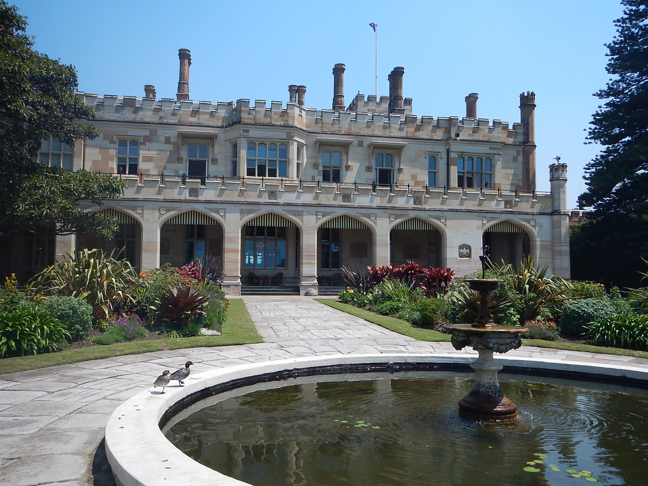 I didn’t feel jet lagged at all since I slept a good deal on the flight from Los Angeles. It probably might have been the adrenaline rush of being here in Australia for the first time. Tim and I decided to take a walk towards the Opera House and explore portions of downtown Sydney. We went up through Hyde Park, by the Archibald Fountain and up to the Botanic Gardens. I was fascinated by the sights and sounds of exotic birds in the area, particularly the cockatoos and ibises (which look interesting but apparently are garbage birds like pigeons). The gardens had all kinds of trees, notably the vibrant purple, sweet smelling jacaranda trees. After exploring the Botanical Gardens, we went to the Government House, which is the residence and office of the Governor of New South Wales.