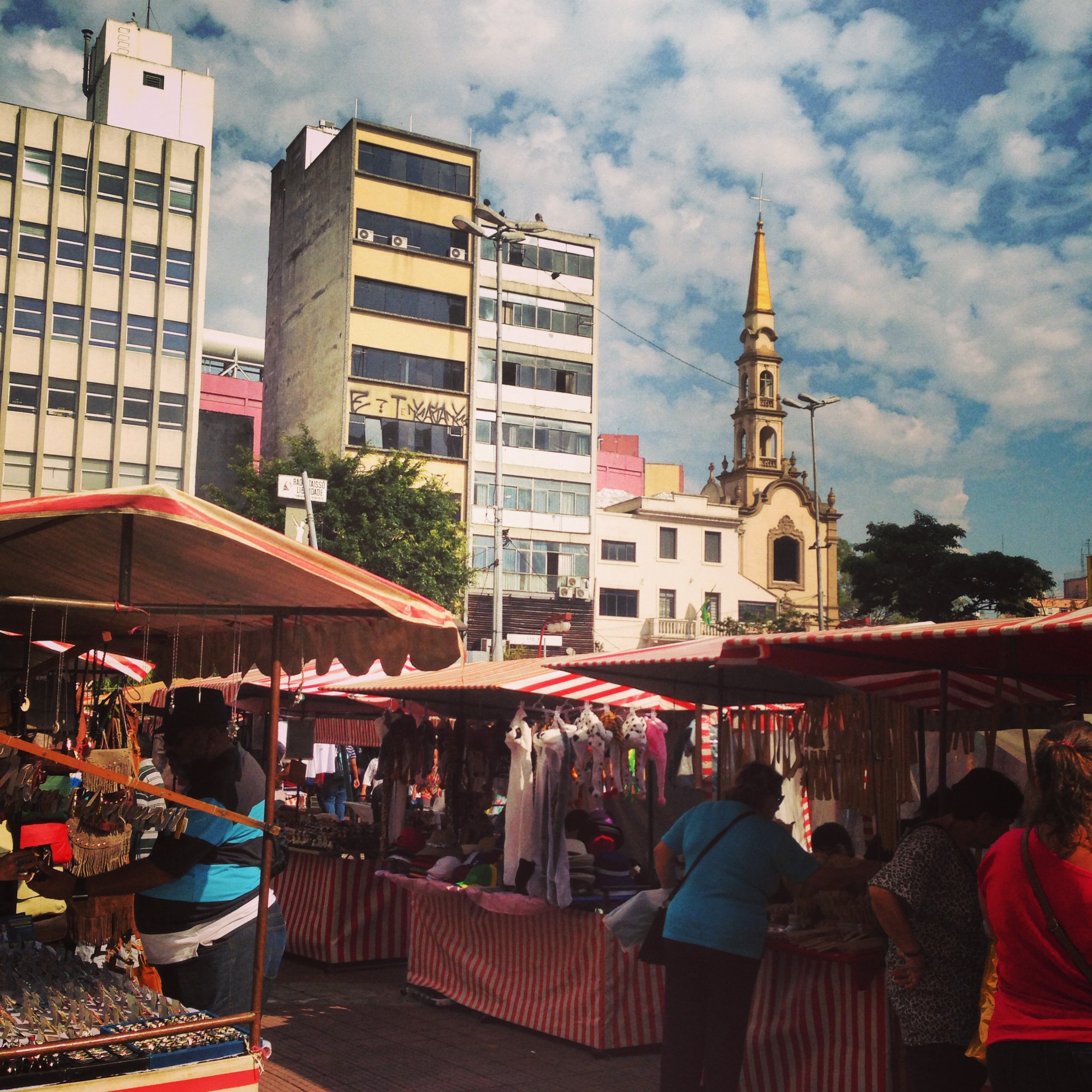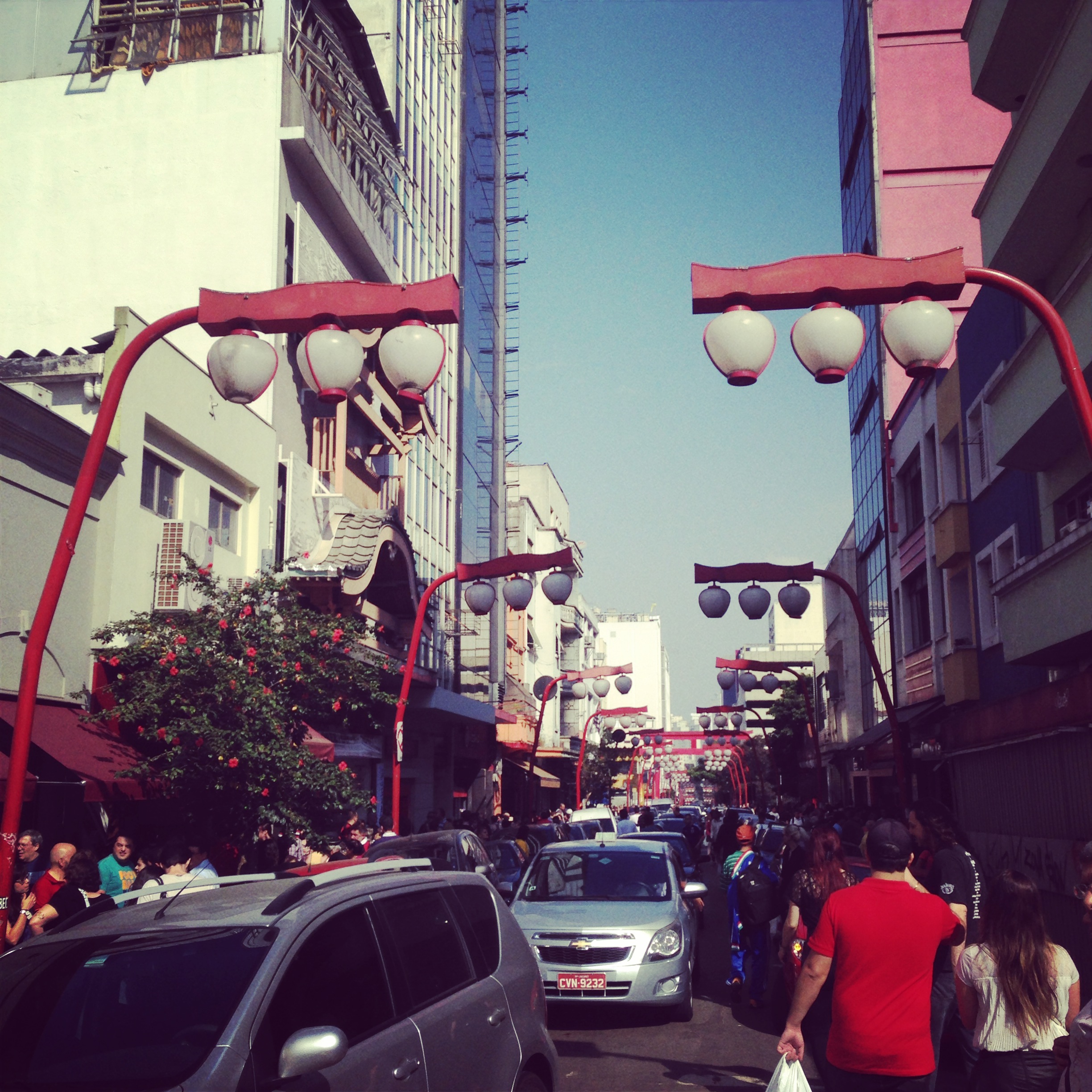 A walk down Rua Galvão Bueno between the main square and Rua São Joaquim is a journey that will make you think you’ve been magically transported from São Paulo to Tokyo.  The street, like other streets in Liberdade, is adorned with Japanese style lamposts.  Near a highway overpass is a large red torii, a Japanese gate that one often sees in front of Shinto temples.  Along the street, you can find several shops selling Asian foods and goods that may be difficult to find elsewhere in São Paulo.  The Marukai market is an especially popular place to browse and sample exotic grocery items, though it is often uncomfortably crowded.  Other shops sell souvenirs, a mix of samurai swords, sake, geisha dolls and teacups along with traditional Brazilian souvenirs like flip-flops, soccer jerseys, and gemstones.  Along Galvão Bueno, you’ll also find vendors sitting on the sidewalk selling pirated items.  These people hurriedly scoop up their goods into their blankets and run away whenever the police come down the street.  A walk down Rua Galvão Bueno is also interesting for its street art and historic architecture, some buildings in better shape than others.