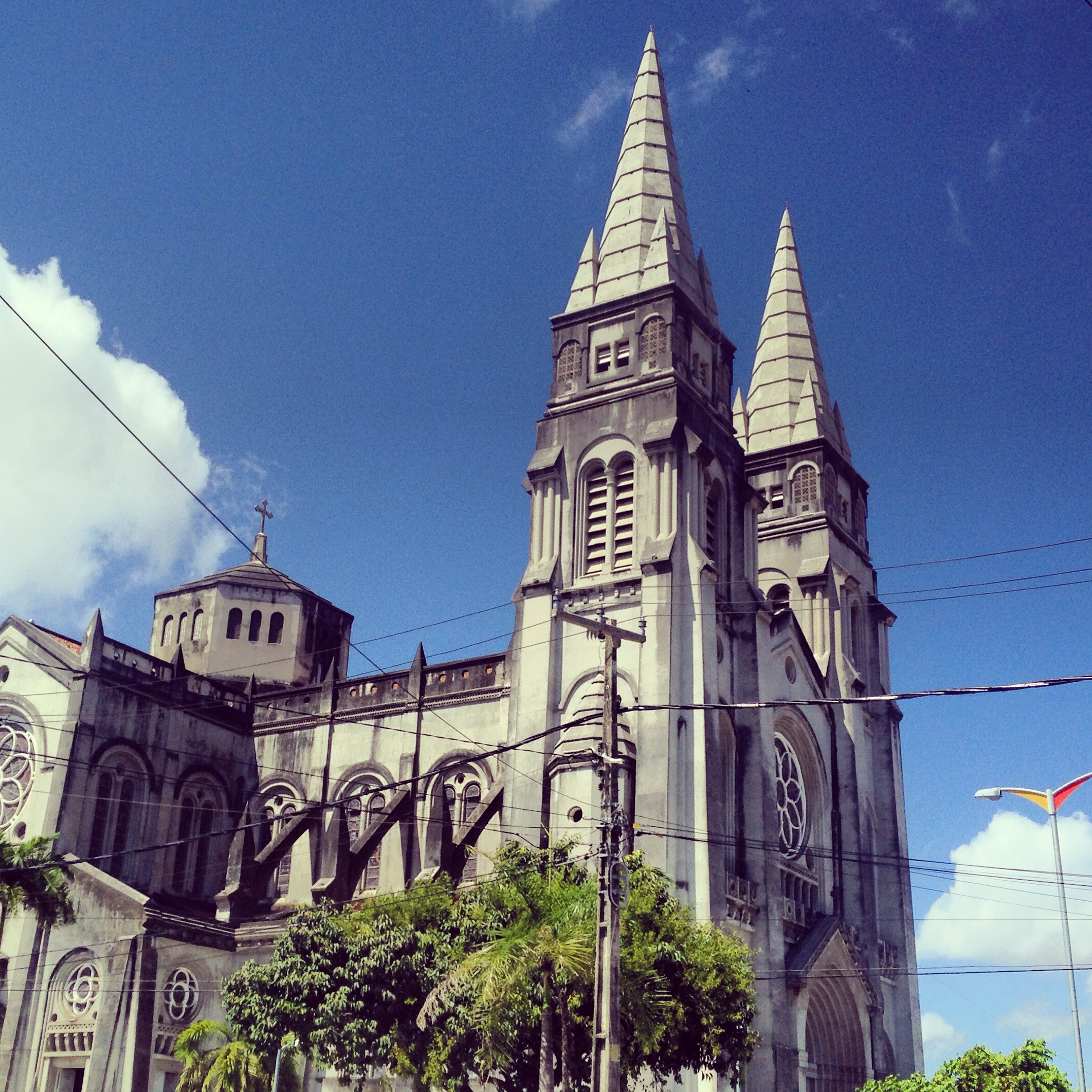 Constructed between 1939 and 1978, the Metropolitan Cathedral of Fortaleza was designed by architect George Maunier in the eclectic style, combining elements of gothic and romanesque. The cathedral is the seat of the Archdiocese of Fortaleza. The interior is white and simple in design, but illuminated by colorful stained-glass windows. Next to the cathedral is the market where you began the walk.